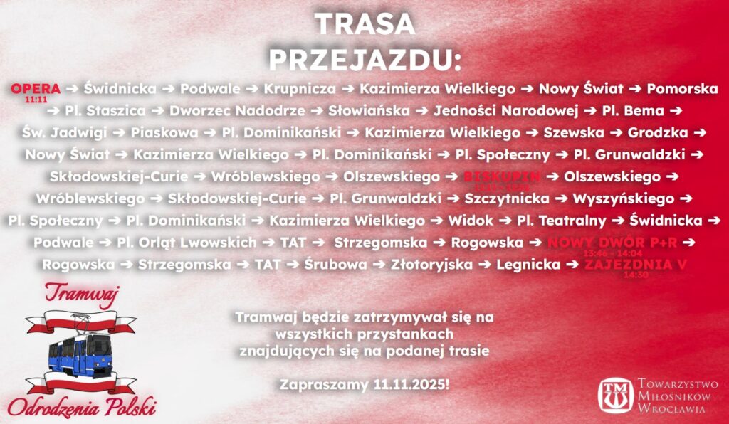 O godz. 11:11 z przystanku „Opera” wyruszy Tramwaj Odrodzenia Polski, który przejedzie przez historyczne centrum miasta, zatrzymując się m.in. na Biskupinie i Nowym Dworze, kończąc przy Zajezdni V. To niepowtarzalna okazja, by połączyć pasję do komunikacji miejskiej z patriotycznym świętowaniem.