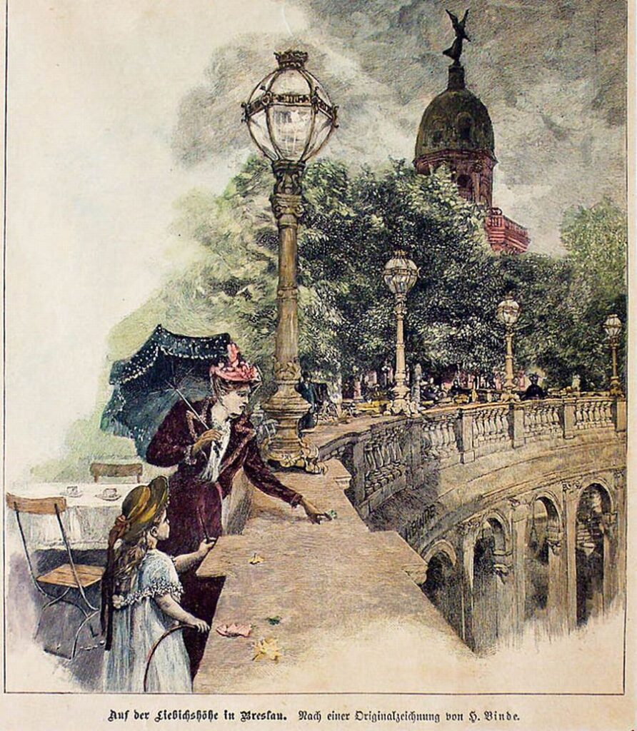 W XIX wieku, po zakończeniu militarnej roli fortyfikacji, wzgórze zaczęło pełnić funkcję rekreacyjną. Bracia Liebichowie, znani wrocławscy przedsiębiorcy, zbudowali tutaj belweder z kolumnadą i gloriettą, tworząc elegancką przestrzeń spacerową z fontannami i tarasami. To miejsce szybko stało się wizytówką miasta – odbywały się tu koncerty, pokazy ogni i spacery pośród zieleni.