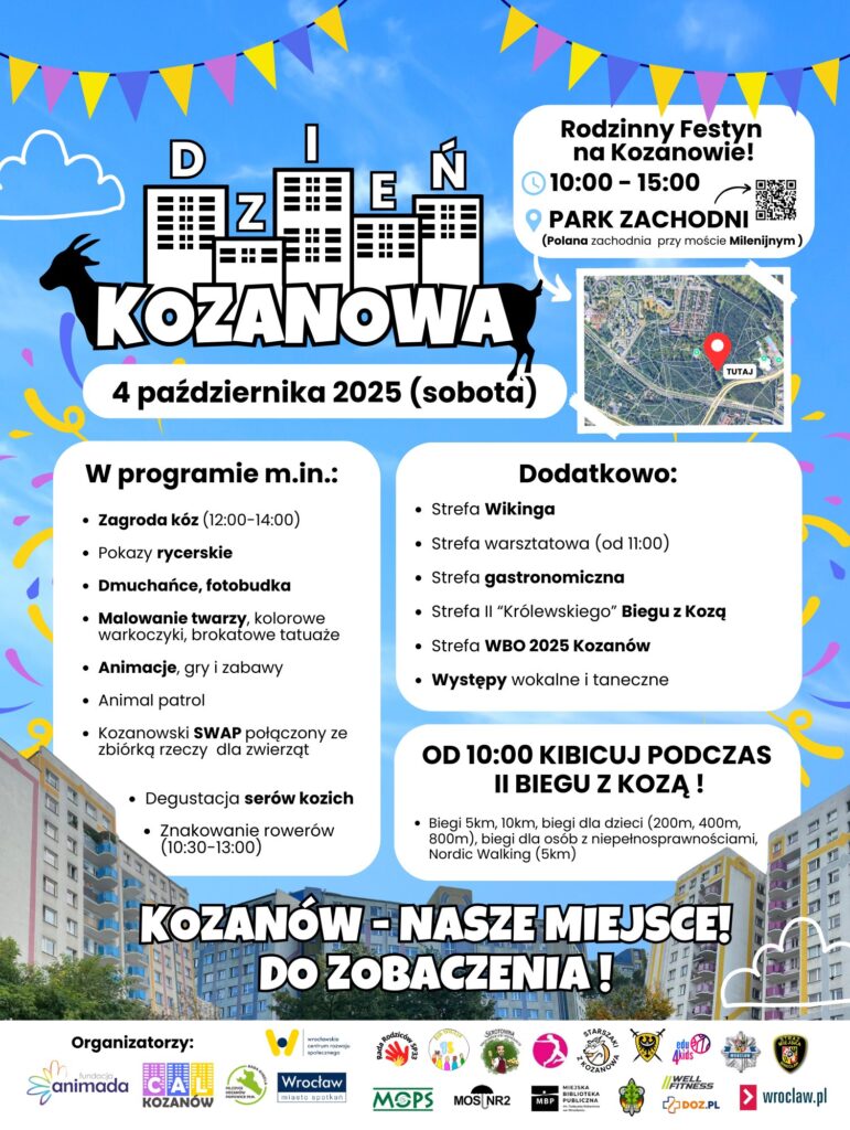 W pierwszą sobotę października Kozanów zamienia się w miejsce pełne radości, muzyki i zabawy. 4 października 2025 r., w godzinach 10:00–15:00, na dużej polanie w Parku Zachodnim niedaleko Mostu Milenijnego odbędzie się wyjątkowe święto osiedla – Dzień Kozanowa, organizowany dzięki inicjatywie Centrum Aktywności Lokalnej oraz fundacji Animada. To wydarzenie, które łączy pokolenia i daje okazję, by wspólnie spędzić czas – od najmłodszych po seniorów. Festyn wzbogaci II „Królewski” Bieg z Kozą, który wniesie do zabawy ducha sportowej rywalizacji i średniowiecznego klimatu.