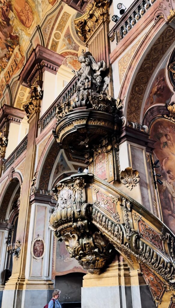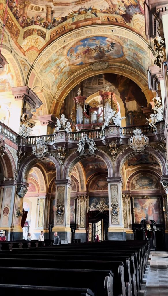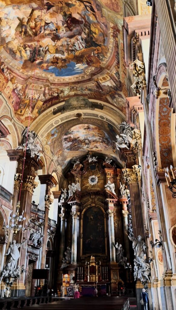 Wnętrze kościoła zachwyca przepychem i dbałością o każdy detal. Sklepienia zdobią iluzjonistyczne freski Johanna Michaela Rottmayra, które przenoszą wiernych w biblijne sceny. Barokowe ołtarze, wykonane z kolorowego marmuru i bogato rzeźbione, są arcydziełami sztuki. Szczególną uwagę przyciąga ołtarz główny z obrazem Najświętszego Imienia Jezus, który stanowi centralny punkt duchowy świątyni.