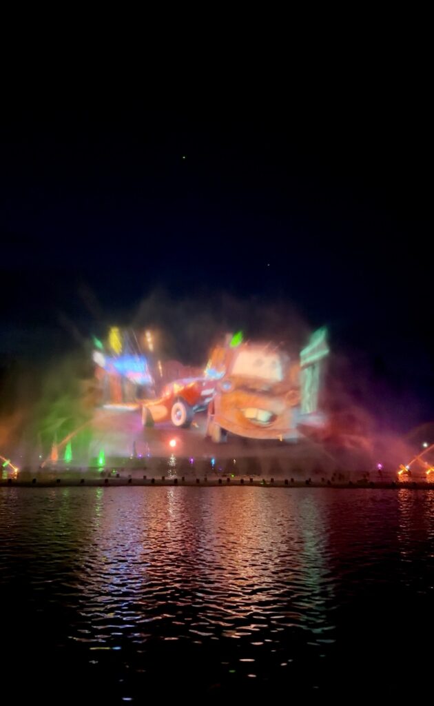 Spektakl zachwyca bogactwem efektów — setki dysz wyrzucają wodę w rytm muzyki, setki podwodnych świateł LED rozświetlają całą Pergolę, a dodatkowe gejzery ognia nadają widowisku wyjątkowej dynamiki. Na ekranie wodnym pojawiają się barwne animacje i fragmenty filmów, a całości towarzyszą utwory autorstwa Randy’ego Newmana, Michaela Giacchino i innych kompozytorów związanych z Pixarem. Nie brakuje też polskiego akcentu – w programie znalazła się piosenka „Ty druha we mnie masz” w wykonaniu Stanisława Soyki.