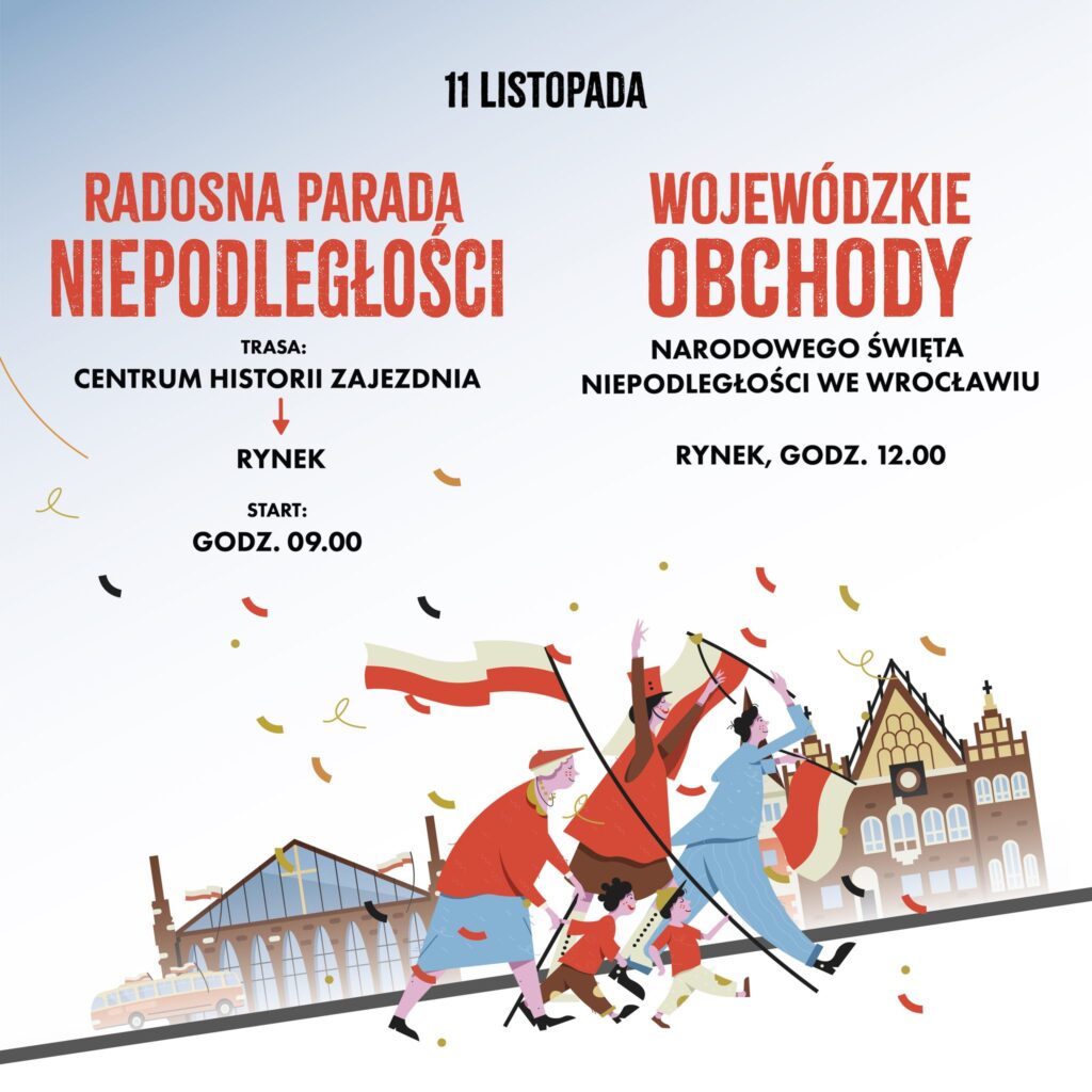 Kulminacją obchodów będzie XXII Radosna Parada Niepodległości 11 listopada, startująca o godz. 9:00 spod Centrum Historii Zajezdnia i prowadząca przez pl. Legionów, ul. Krupniczą, Kazimierza Wielkiego i ul. Gepperta aż do Rynku. O godz. 12:00 wspólnie odśpiewamy Mazurek Dąbrowskiego i rozpoczniemy Wojewódzkie Obchody Święta Niepodległości.
