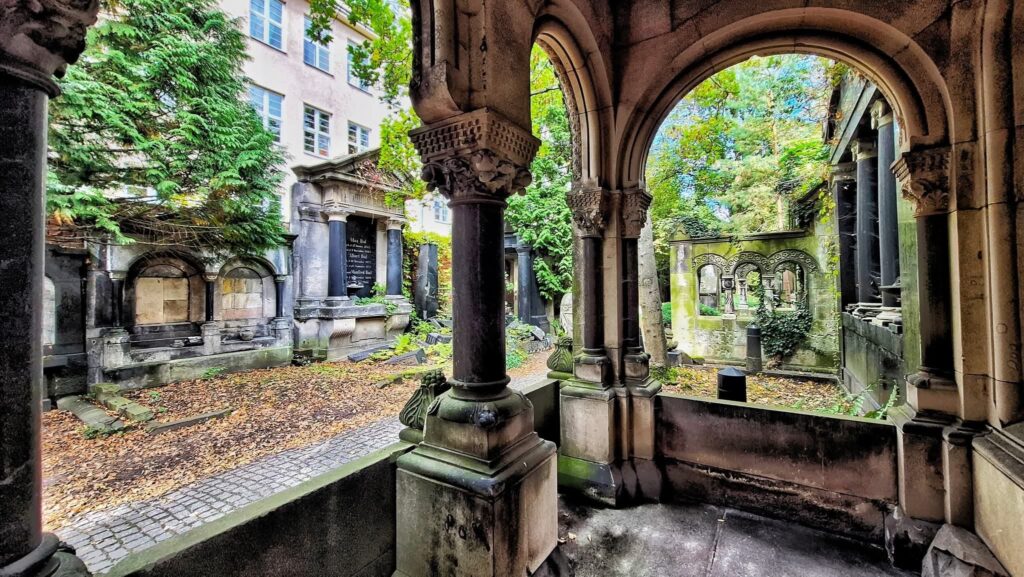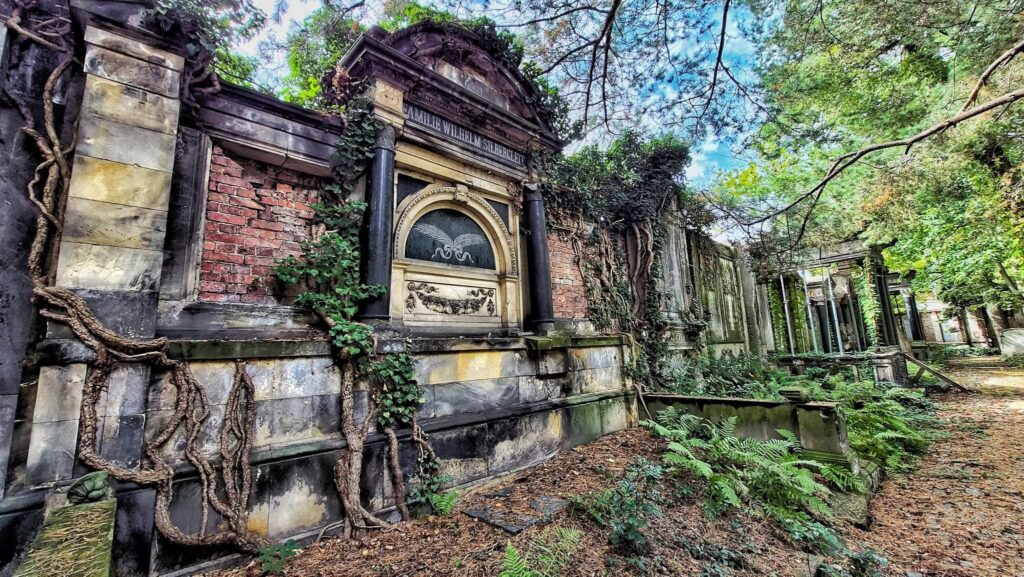Spacerując wąskimi alejkami, łatwo zapomnieć, że to środek miasta. Bluszcz wspina się po marmurowych kolumnach, stare lipy szumią ponad secesyjnymi wrotami, a między grobowcami przemykają dzięcioły i wiewiórki.