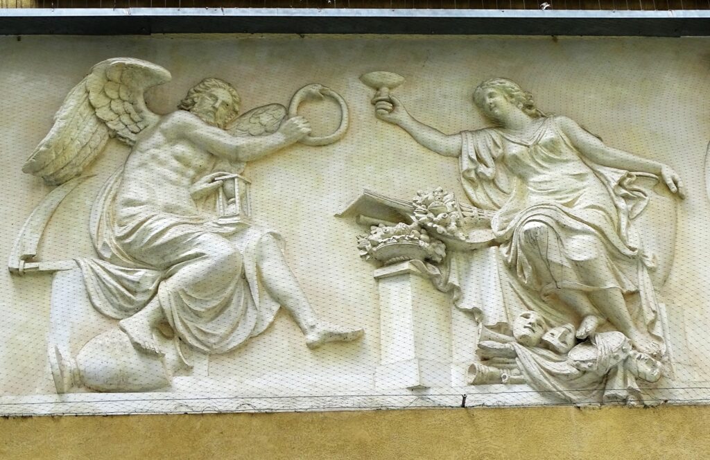 Kiedy przyjrzymy się reliefowi bliżej, dostrzeżemy brodatego mężczyznę ze skrzydłami u ramion – to Chronos, symbol czasu, przemijania i nieuchronności losu. W dłoniach trzyma klepsydrę i węża połykającego własny ogon – znaki wiecznego cyklu życia. Obok niego siedzi Talia z czarką i rogiem obfitości – opiekunka radości i sztuki.