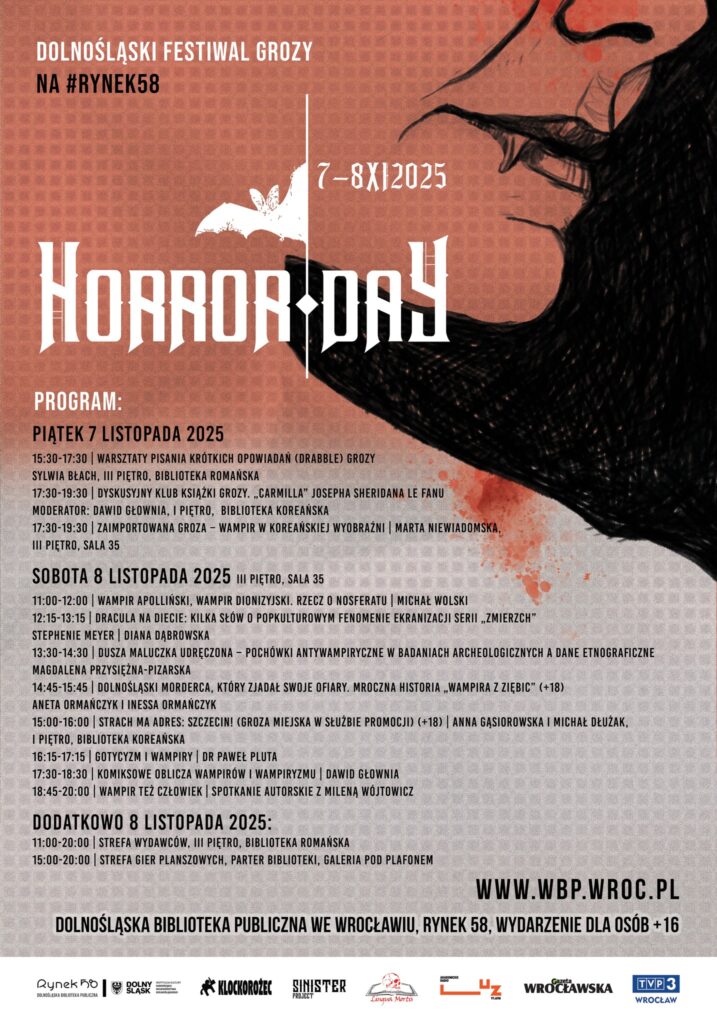 „Horror Day” to już nie tylko festiwal – to stały punkt jesiennego kalendarza Wrocławia. Od ponad dekady Dolnośląska Biblioteka Publiczna udowadnia, że groza może być inteligentna, twórcza i refleksyjna. W programie nie ma miejsca na tanie straszenie – zamiast tego uczestnicy mogą liczyć na solidną dawkę wiedzy, kultury i dobrej zabawy w klimacie gotyckiego misterium. A wszystko to w samym sercu miasta – dosłownie kilka kroków od ratusza.